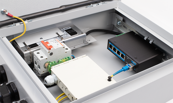 В данном решении уже есть всё, что необходимо для подключения оптико-волоконной линии связи. Внутри корпуса шкафа установлены и подключены: