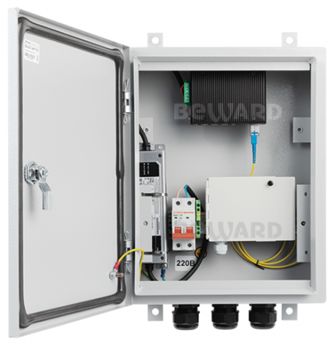 Питание коммутатора осуществляется от сети переменного тока 220В. Для этого шкаф оборудован автоматическим выключателем. Для подключения кабелей,B-431-4P1F2 имеет 3 гермоввода для гофротрубы диаметром 18-25 мм. Оборудование в шкафу закреплено на DIN-рейках, шкаф закрывается трехгранным ключом.